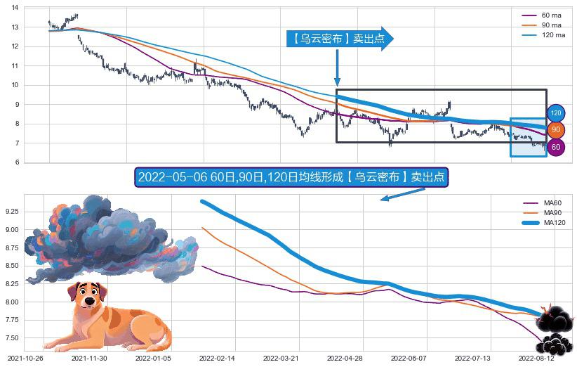 形态多维评估: ⚀ 2022-01-21日-2022-08-12日显现 60日-90日-120日均线 【乌云密布】卖出点 看空信号,后市看跌,卖出