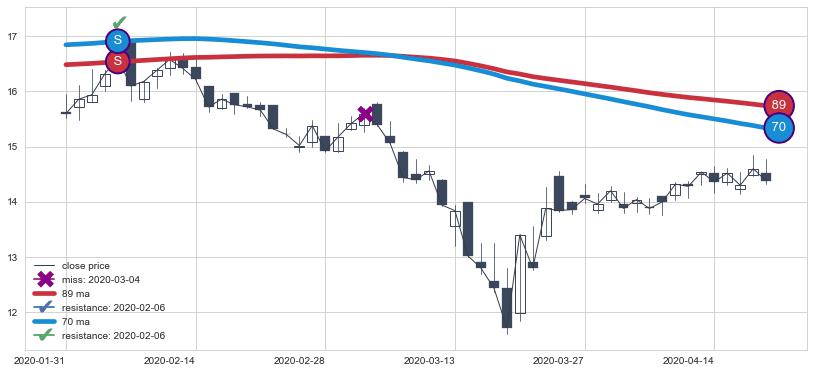 下跌趋势2020-01-31-2020-04-20,均线89, 70确认关键阻力1处