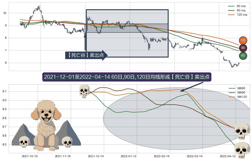 形态多维评估: ⚀ 2021-12-02-日至2022-04-14-日显现 60日-90日-120日均线 【死亡谷】卖出点 看空信号,后市看跌,卖出