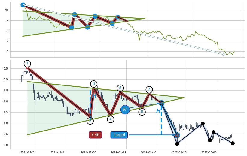 ➣ 【多空双方观望→争持→促使价格波动日益狭窄→空方打破攻守平衡点】对称三角形中继整理, 已在2022-02-24突破【支撑】颈线 8.92 →演变成下降通道