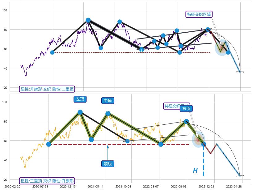 ➢ 升旗形虽然低点抬高速度快,但创新高幅度有限,升旗过程中指标出现【顶背离】