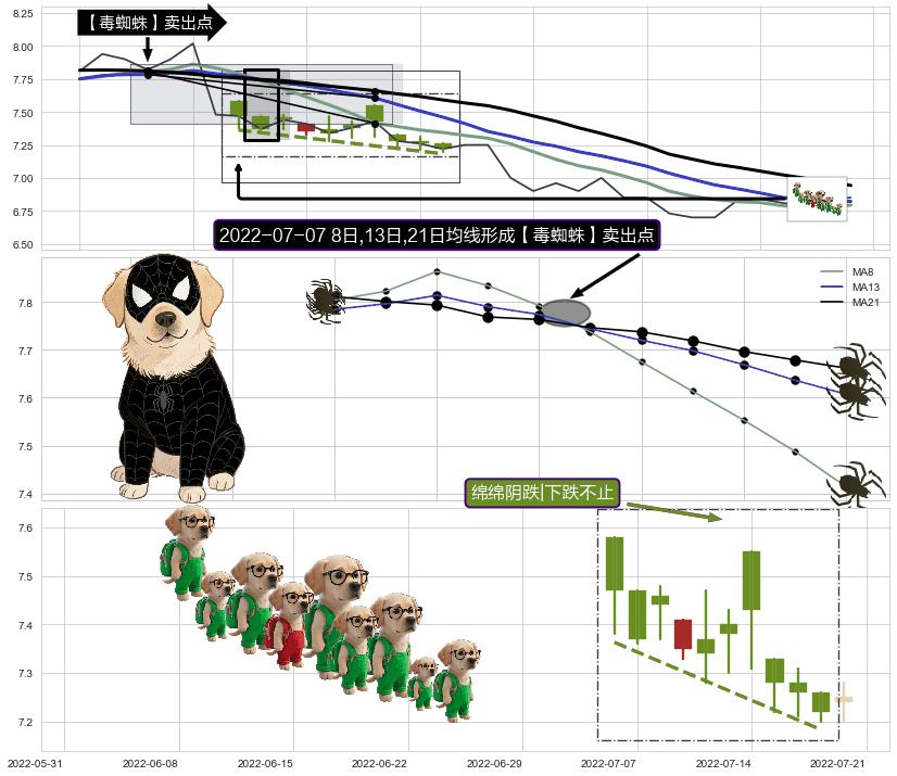 | 3 🅚:【毒蜘蛛】卖出点 ➕ 📐:下降三角整理下行突破支撑位破位, 猜想持续下沉下跌,被突破的支撑位已变为阻力位 ☞ 看空信号 ⇥ 【均线】交织【图形】⇥ 综合量化分数: 35 | > |