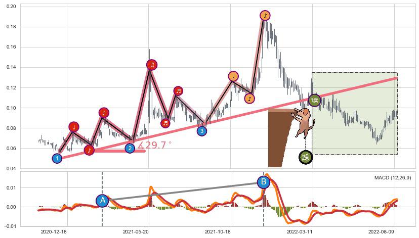 ♘ 支撑价格位0.0641172,可信任强度96.70%,距离最后交易2022-08-12形成的收盘价格0.0950000相差 -32.51%