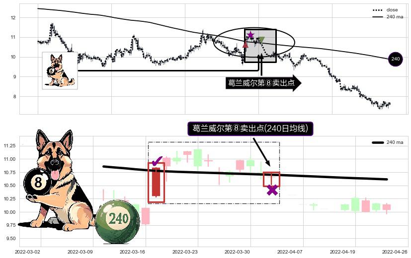 形态多维评估: ⚀ 2022-04-01-日显现 葛兰威尔均线 240日均线 第⑧卖出点 下降趋势的中继信号,后市看跌,卖出信号