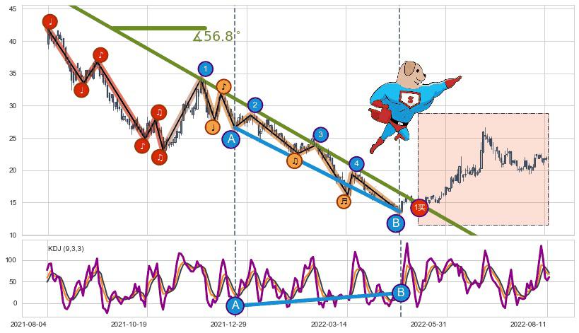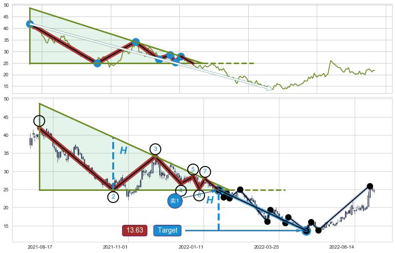 ➣ D点拟合预测价格33.75,距离最后交易收盘价格21.75相差 +55.19%