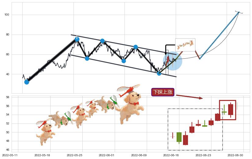 | 12 🅚:上涨螺旋桨形态 ➕ 🎢:【高山滑雪】买入点均线组合买入点信号形成后,猜想后续下行结束,持续反弹上涨(均值回复) ☞ 看多信号 ⇥ 【均线】交织【🅚线】⇥ 综合量化分数: 58 | > |