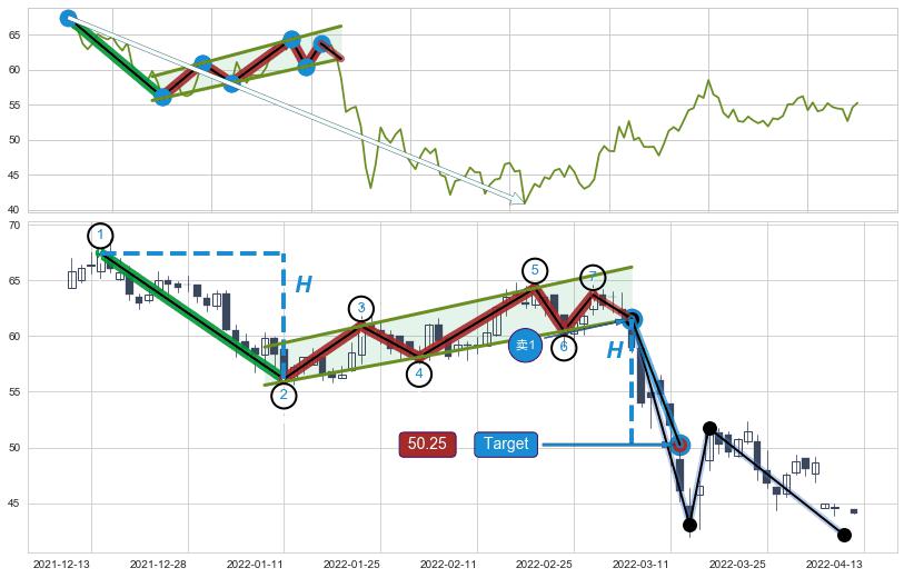 ➣ D点拟合预测价格57.49,距离最后交易收盘价格55.25相差 +4.05%