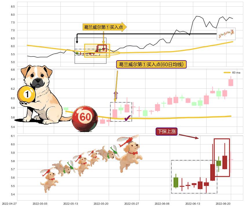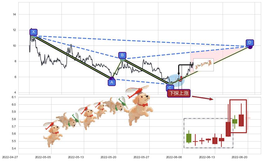 ➣ 低点影线(2022-04-29: 5.16 )→回踩→第二根k线低点(2022-04-28: 5.24 )