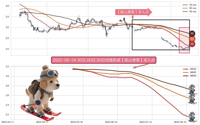 ⚀ 2022-05-05日-2022-08-12日显现 30日-60日-90日均线 【高山滑雪】买入点 看多信号,后市看涨,买入