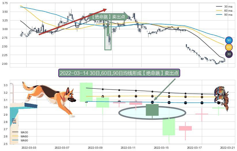 ⚀ 2022-03-14日显现 30日-60日-90日均线 【绝命跳】卖出点 看空信号,后市看跌,卖出