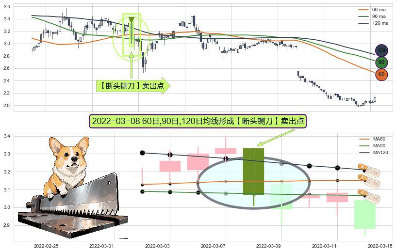 ⚀ 2022-03-08日显现 60日-90日-120日均线 【断头铡刀】卖出点 看空信号,后市看跌,卖出