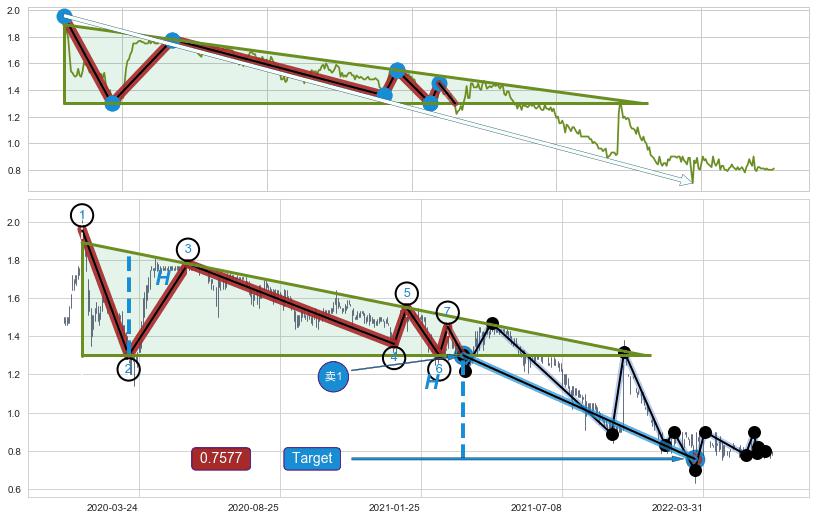 ➢ 最小中继整理跌幅→𝐇: 0.214737 (低点逐步抬高斜边第一支撑点②与阻力边垂直距离)