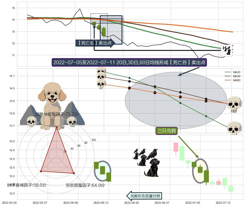 | 2 🅚:【死亡谷】卖出点 ➕ 📐:升楔型下行突破支撑位破位, 猜想持续下沉下跌,被突破的支撑位已变为阻力位 ☞ 看空信号 ⇥ 【均线】交织【图形】⇥ 综合量化分数: 20 | > |