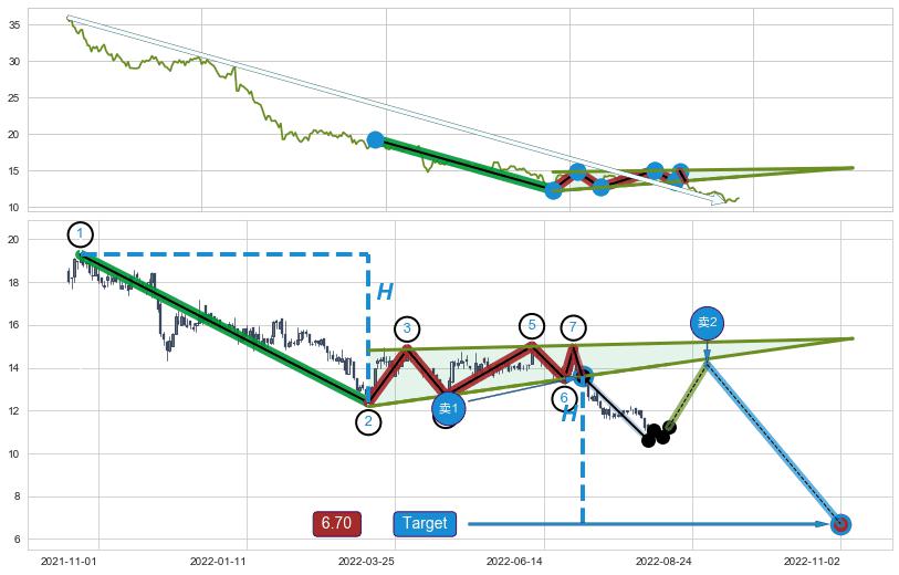➢ 最小中继整理跌幅→𝐇: 6.90 (𝐇楔型旗杆的长度:楔型起点→顶点)