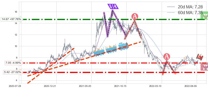 ♘ 支撑价格位7.05,可信任强度84.90%,距离最后交易2022-08-12形成的收盘价格7.42相差 -4.99%
