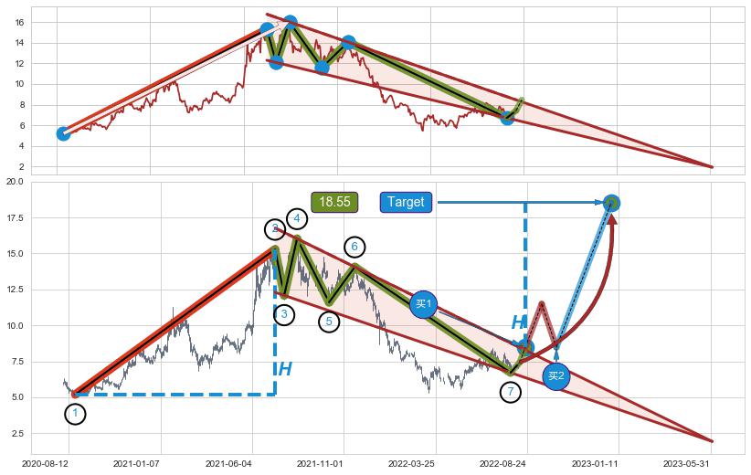 ➢ 最小中继整理涨幅→𝐇: 10.09 (𝐇楔型旗杆的长度:楔型起点→顶点)