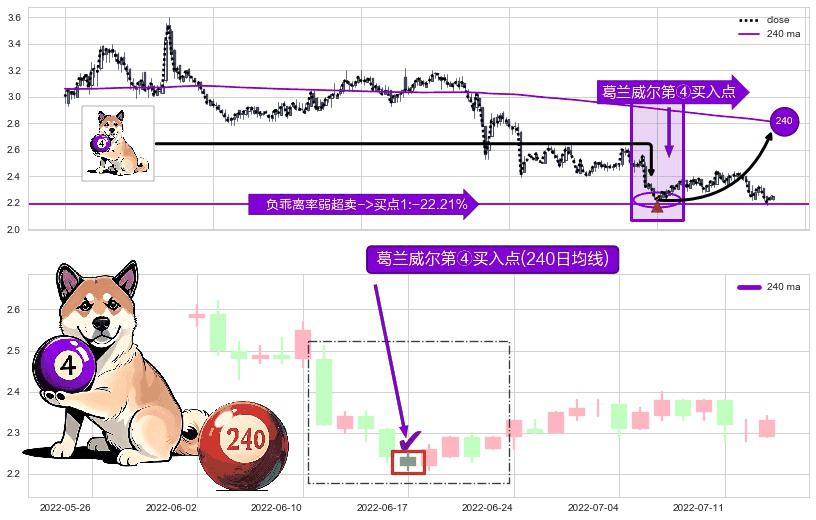 形态多维评估: ⚀ 2022-06-17-日显现 葛兰威尔均线 240日均线 第④买入点 下降趋势均值回复的短线反弹信号,后市看涨,买进信号