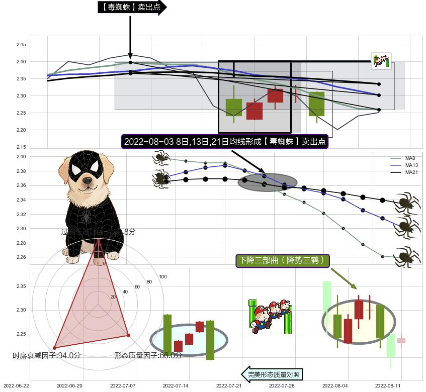 | 2 🅚:【毒蜘蛛】卖出点 ➕ 📐:下降三角整理猜想突破点临近,临近关键支撑位,预期下沉突破下跌 ☞ 看空信号 ⇥ 【均线】交织【图形】⇥ 综合量化分数: 28 | > |
