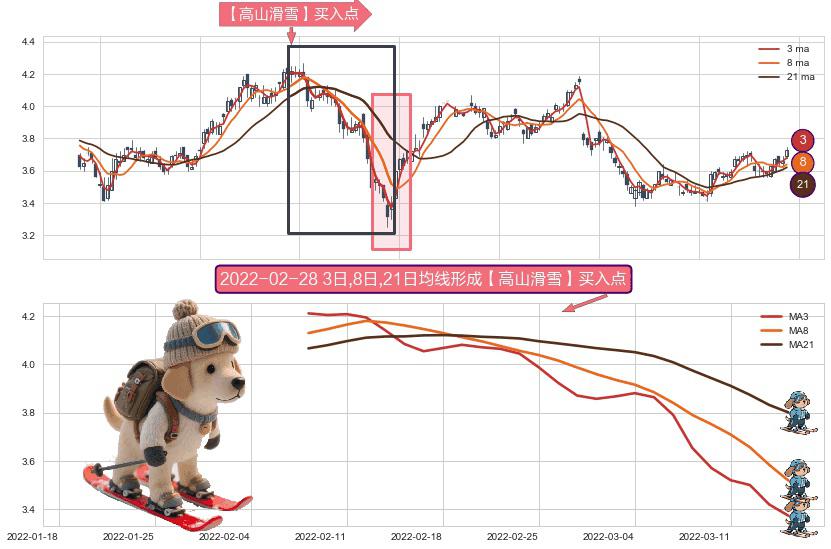 ⚀ 2022-02-09日-2022-03-16日显现 3日-8日-21日均线 【高山滑雪】买入点 看多信号,后市看涨,买入