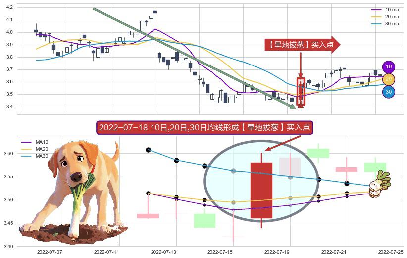 ⚀ 2022-07-18日显现 10日-20日-30日均线 【旱地拔葱】买入点 看多信号,后市看涨,买入
