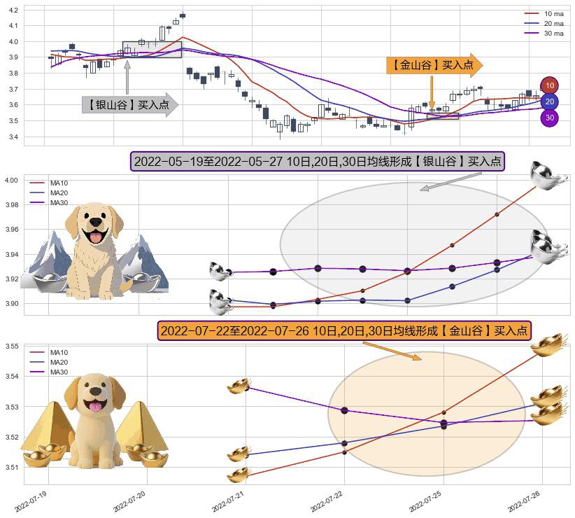 ⚀ 2022-07-25-日至2022-07-26-日显现 10日-20日-30日均线 【金山谷】买入点 其再次确认了买入信号,可靠性更强,买入