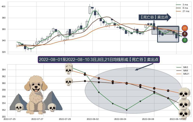 形态多维评估: ⚀ 2022-08-02-日至2022-08-10-日显现 3日-8日-21日均线 【死亡谷】卖出点 看空信号,后市看跌,卖出