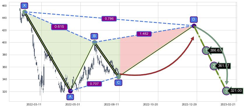 ➣ D点拟合预测价格427.20,距离最后交易收盘价格348.60相差 +22.55%