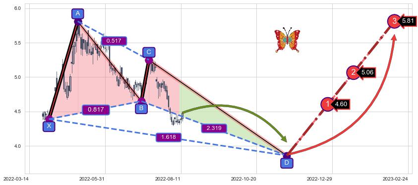 ➣ 未完成【蝴蝶】形态起点X: 2022-03-31, 已到达C点: 2022-07-13, 预测最终D点: 2022-11-17, 共156交易日