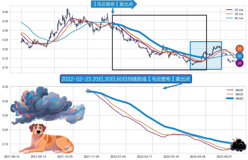 形态多维评估: ⚀ 2021-11-11日-2022-06-10日显现 20日-30日-60日均线 【乌云密布】卖出点 看空信号,后市看跌,卖出