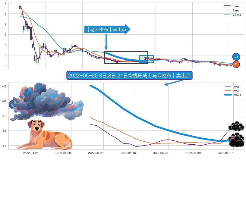 形态多维评估: ⚀ 2022-05-04日-2022-06-07日显现 3日-8日-21日均线 【乌云密布】卖出点 看空信号,后市看跌,卖出