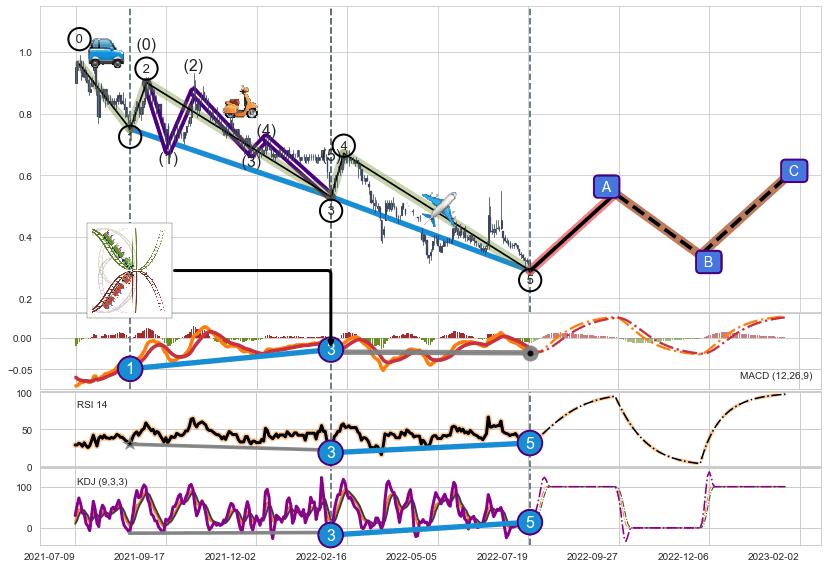 ➢ 1,3,5驱动浪MACD, RSI, KDJ走势都出现【常规背离】反转信号增强