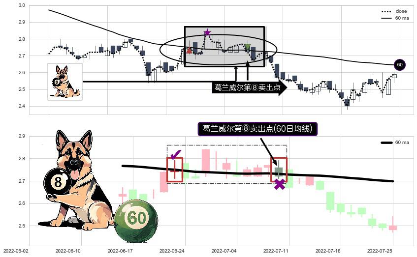 形态多维评估: ⚀ 2022-07-08-日显现 葛兰威尔均线 60日均线 第⑧卖出点 下降趋势的中继信号,后市看跌,卖出信号