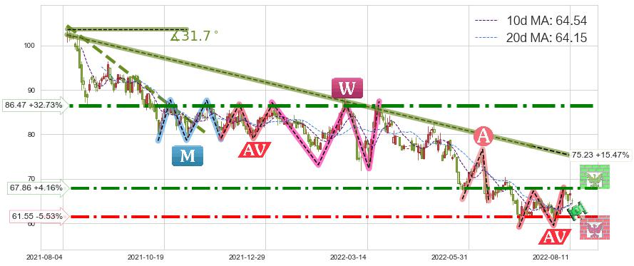 ♘ 阻力价格位67.86,可信任强度72.30%,距离最后交易2022-08-12形成的收盘价格65.15相差 +4.16%
