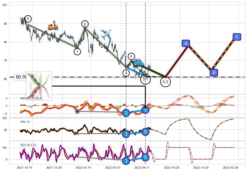 ➣ 5.1: 预测当前第5浪位置(2022-08-01, 61.30),仍然有下跌空间