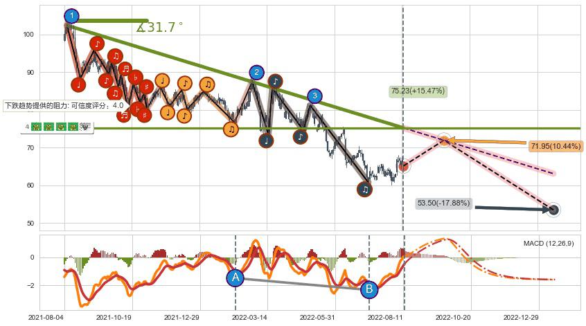 ♘ 阻力价格位86.47,可信任强度93.85%,距离最后交易2022-08-12形成的收盘价格65.15相差 +32.73%