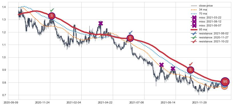 下跌趋势2020-09-09-2021-12-30,均线95确认关键阻力3处