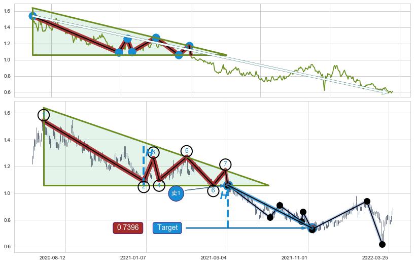 ➢ 【卖1】: 激进型 卖点→(2021-06-07: 1.0600 )形成突破下降三角形整理【整理】形态