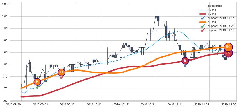 上涨趋势2019-08-20-2019-12-06,均线50, 70确认关键支撑3处