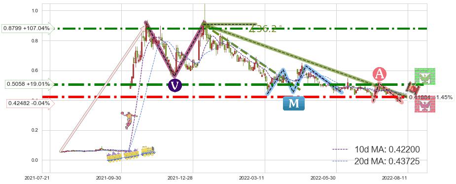 🦴 长线均值回复组合短线趋势跟踪[强阻力信号]2022-01-06-2022-08-11下跌趋势依然成立(下跌趋势跟踪依然存在),短线价格略微上行反弹(均值回复猜想),即将接近下跌趋势提供的未破位阻力价格:0.41884。