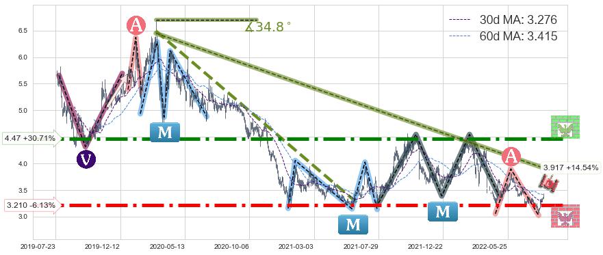 ➣ 【已确认突破】最后价格:3.420与最小【整理】第一目标价格→(2022-09-26: 2.359 )相较: 下跌空间【中等】