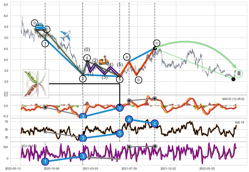 ➢ 1,3,5驱动浪MACD, RSI, KDJ走势都出现【常规背离】反转信号增强