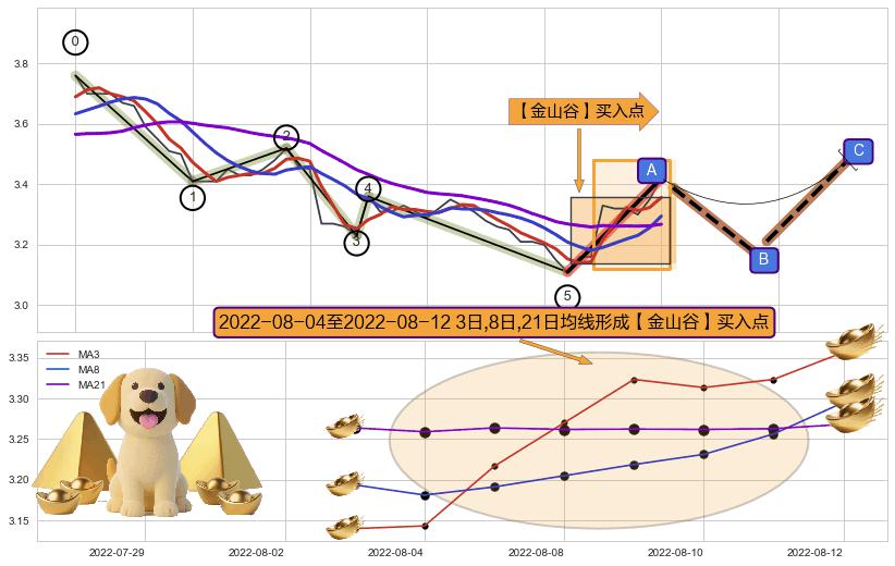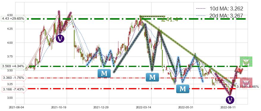♘ 阻力价格位3.569,可信任强度84.71%,距离最后交易2022-08-12形成的收盘价格3.420相差 +4.34%