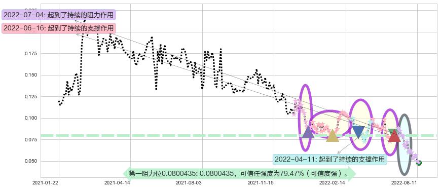 ♘ 阻力价格位0.0800435,可信任强度79.47%,距离最后交易2022-08-12形成的收盘价格0.0480000相差 +66.76%