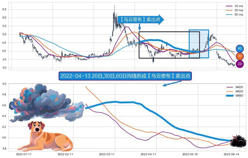 形态多维评估: ⚀ 2022-02-21日-2022-06-10日显现 20日-30日-60日均线 【乌云密布】卖出点 看空信号,后市看跌,卖出