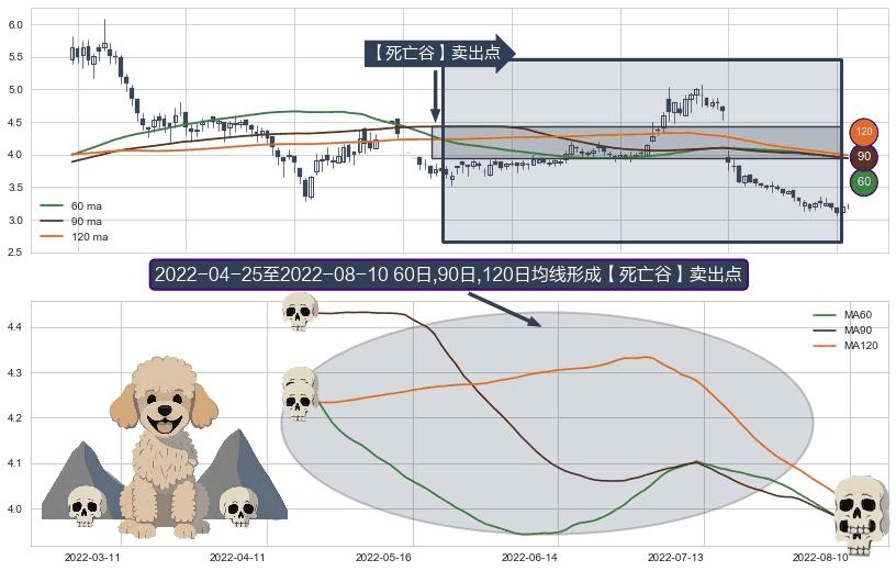 形态多维评估: ⚀ 2022-04-26-日至2022-08-10-日显现 60日-90日-120日均线 【死亡谷】卖出点 看空信号,后市看跌,卖出