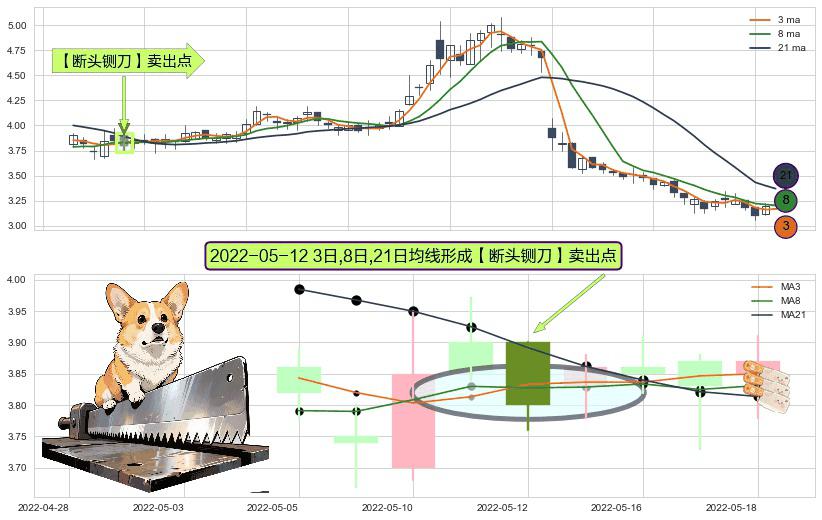 形态多维评估: ⚀ 2022-05-12日显现 3日-8日-21日均线 【断头铡刀】卖出点 看空信号,后市看跌,卖出