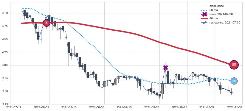 下跌趋势2021-07-19-2021-11-08,均线80确认关键阻力1处