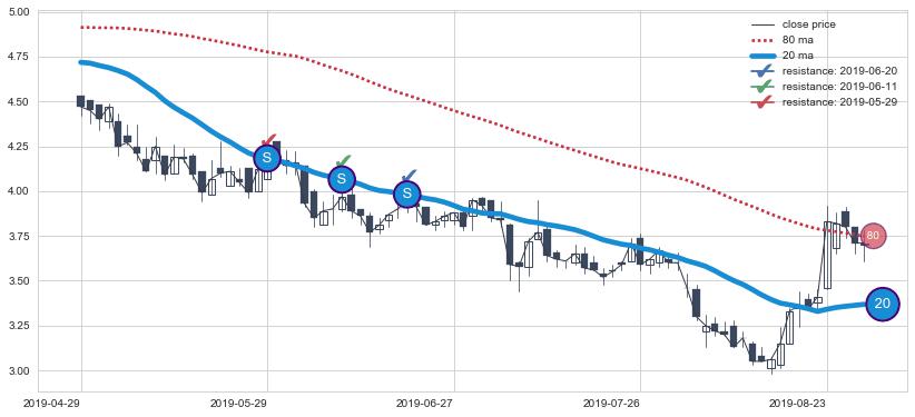 下跌趋势2019-04-29-2019-08-29,均线20确认关键阻力3处