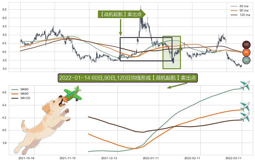 形态多维评估: ⚀ 2021-11-23日-2022-03-11日显现 60日-90日-120日均线 【战机起航】卖出点 看空信号,后市看跌,卖出