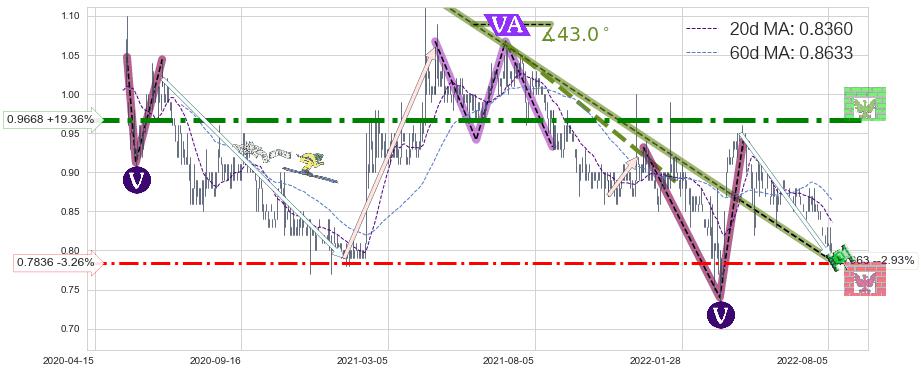 ♘ 阻力价格位0.9668,可信任强度96.90%,距离最后交易2022-08-12形成的收盘价格0.8100相差 +19.36%